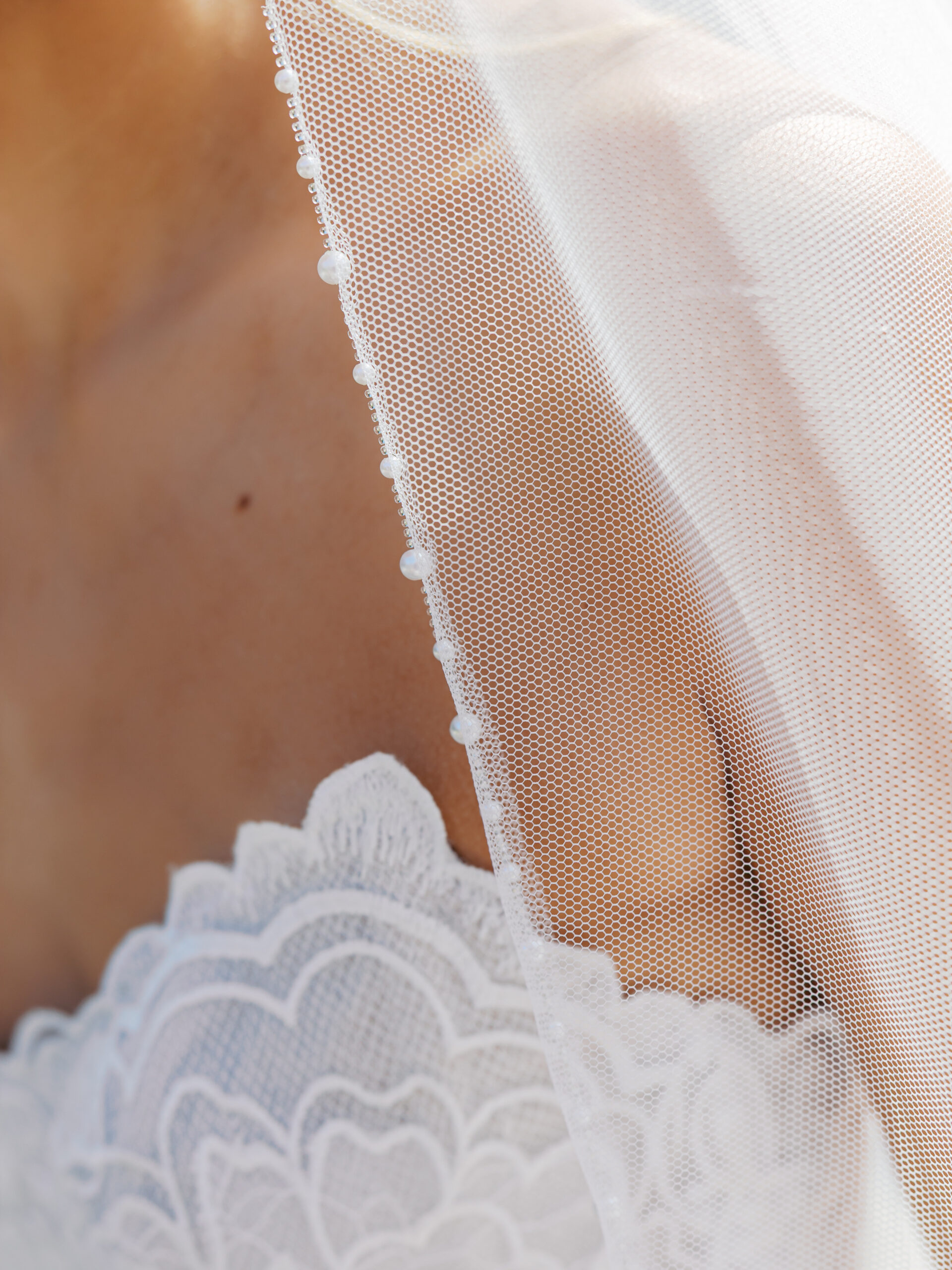 Luxurious Spanish tulle cascades into a cathedral length, trimmed in bubbly pearls