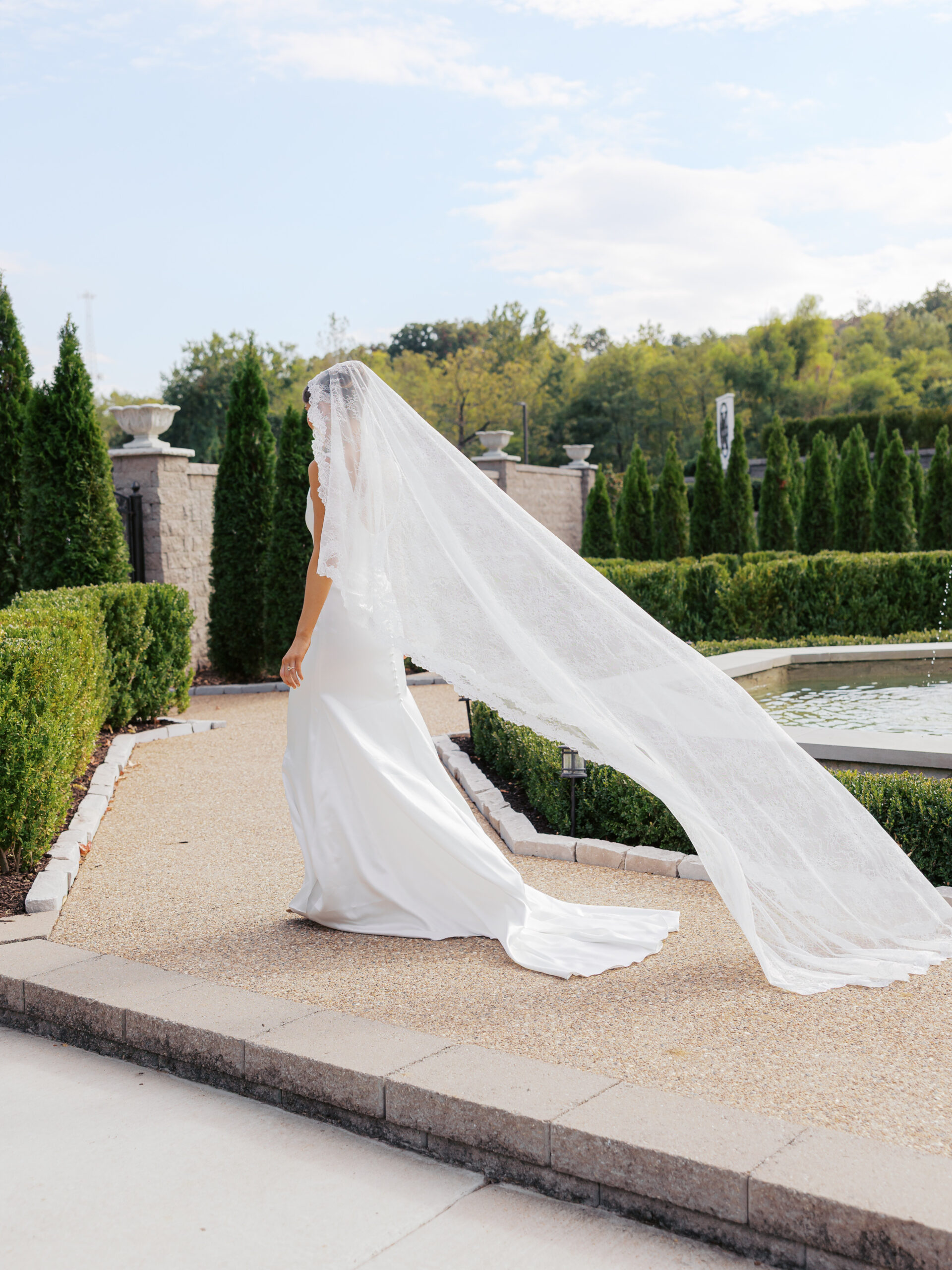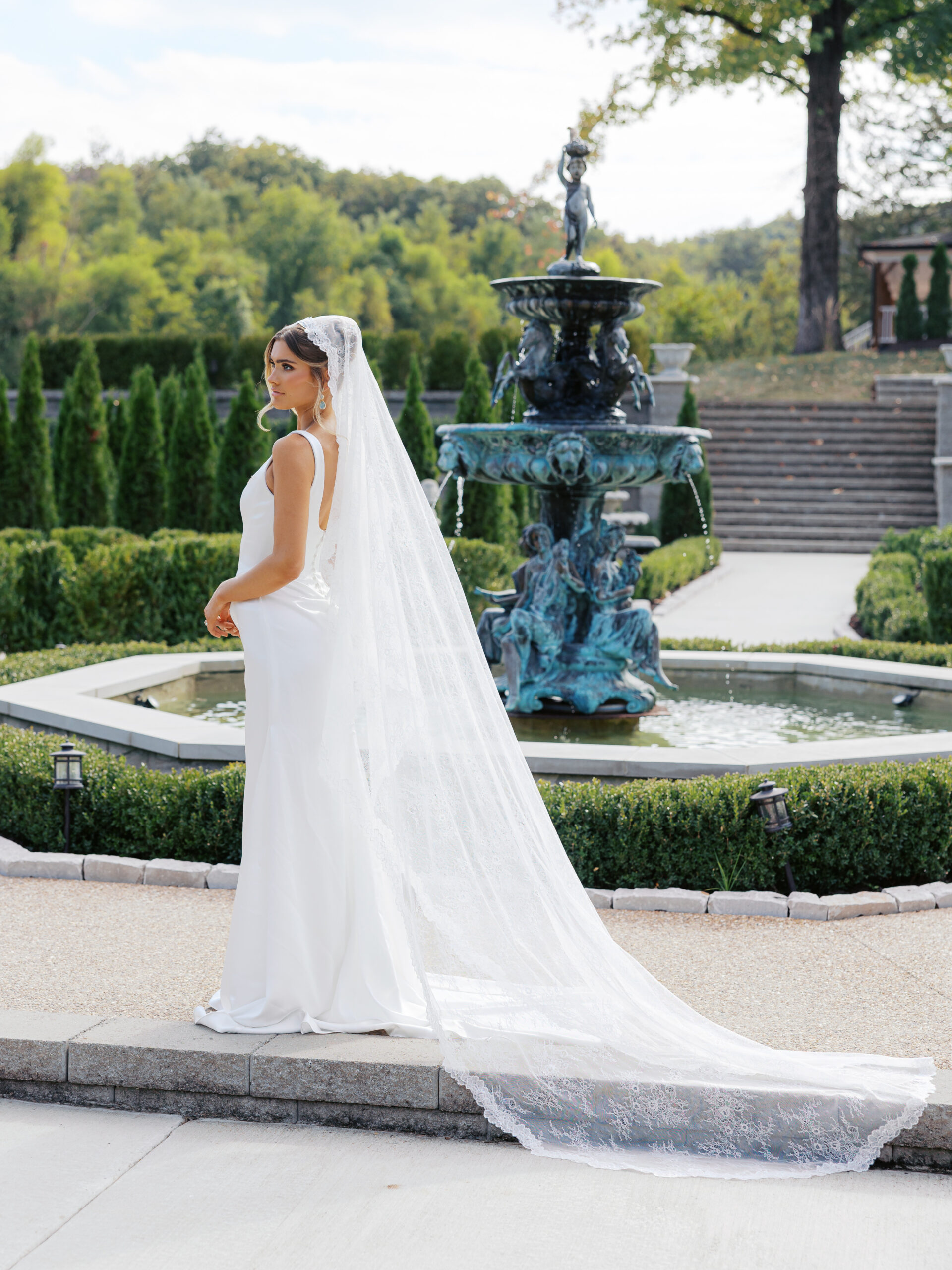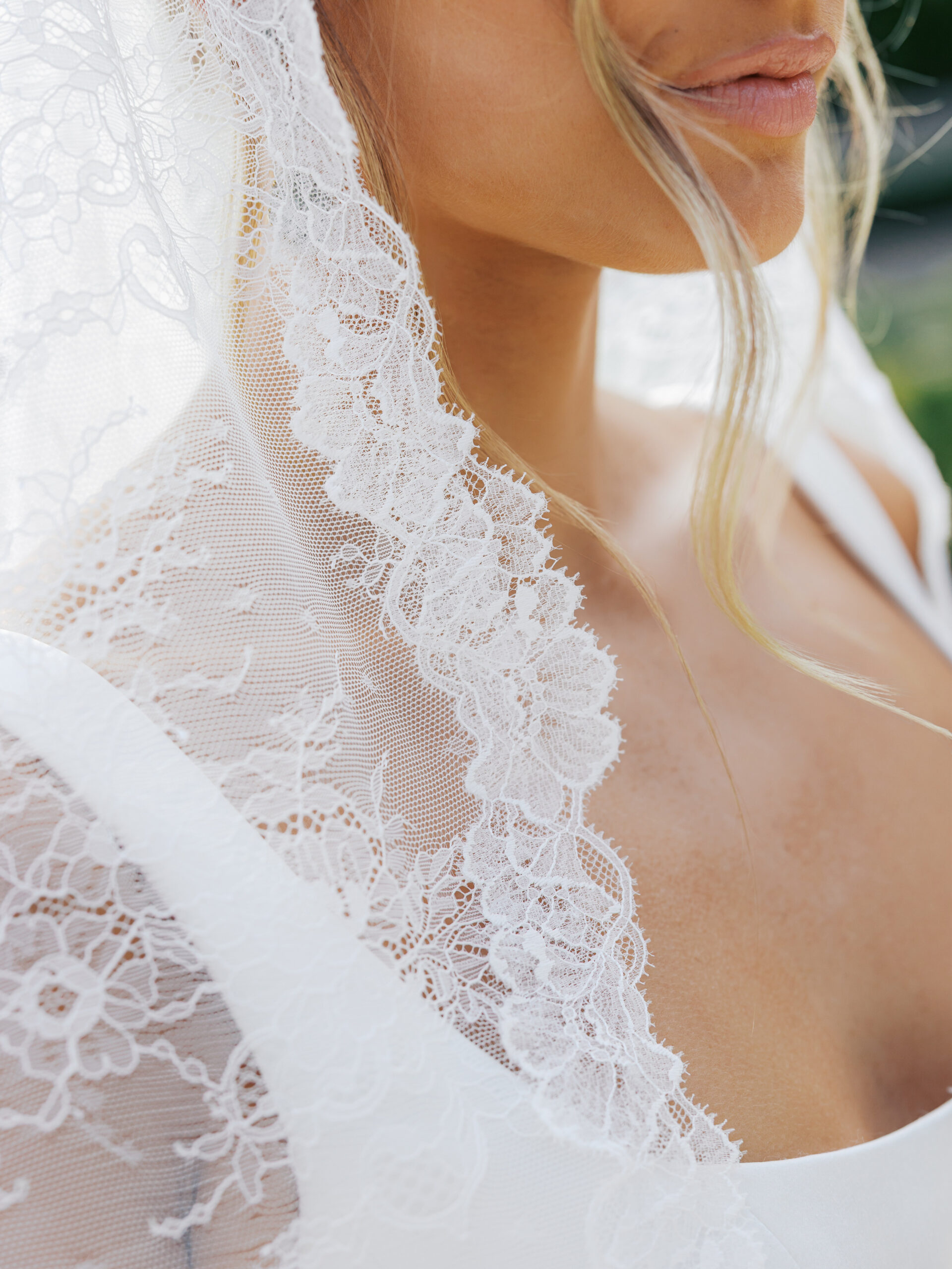 Fully created in delicate Chantilly lace, Nonna features a traditional mantilla silhoutte and lace trim