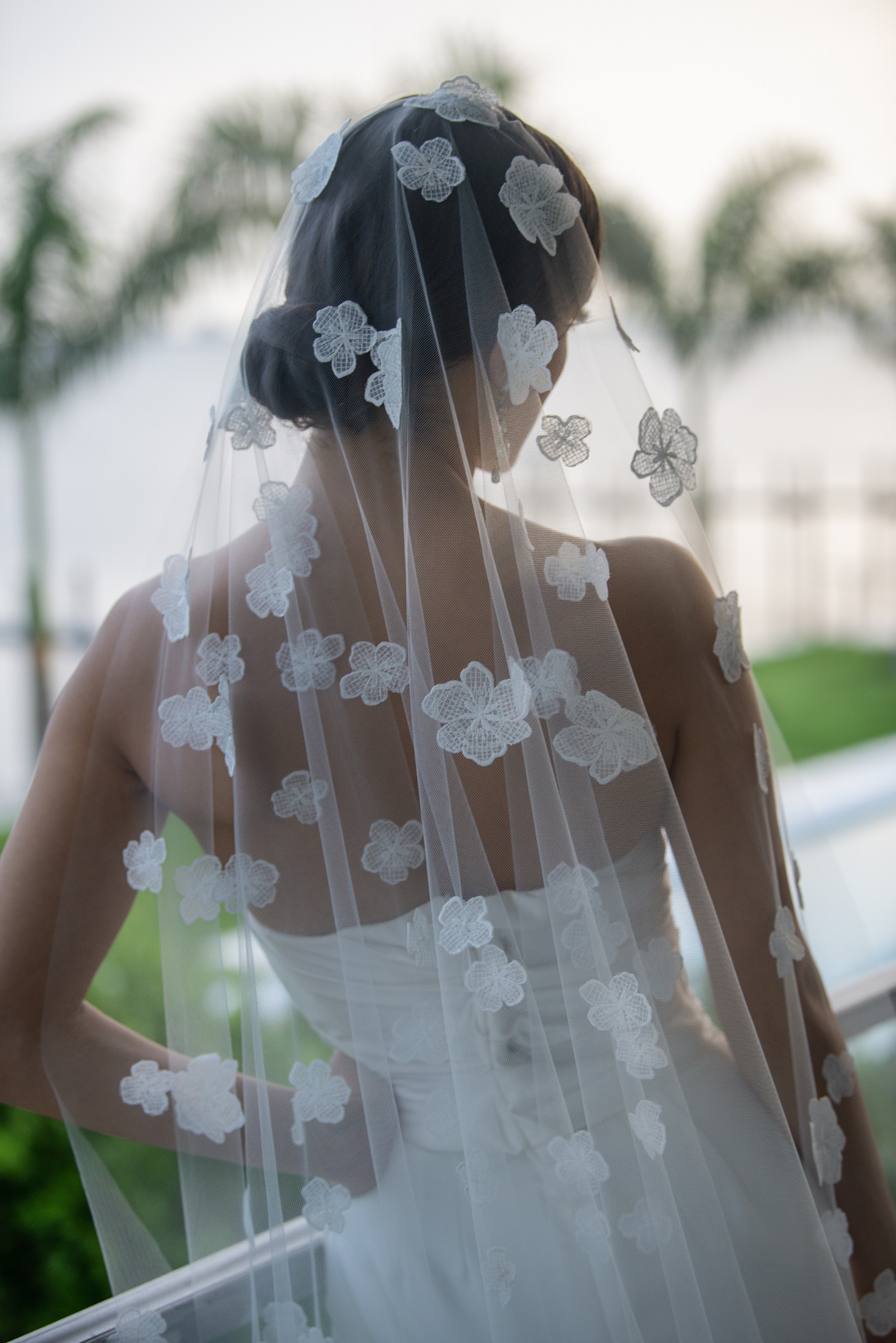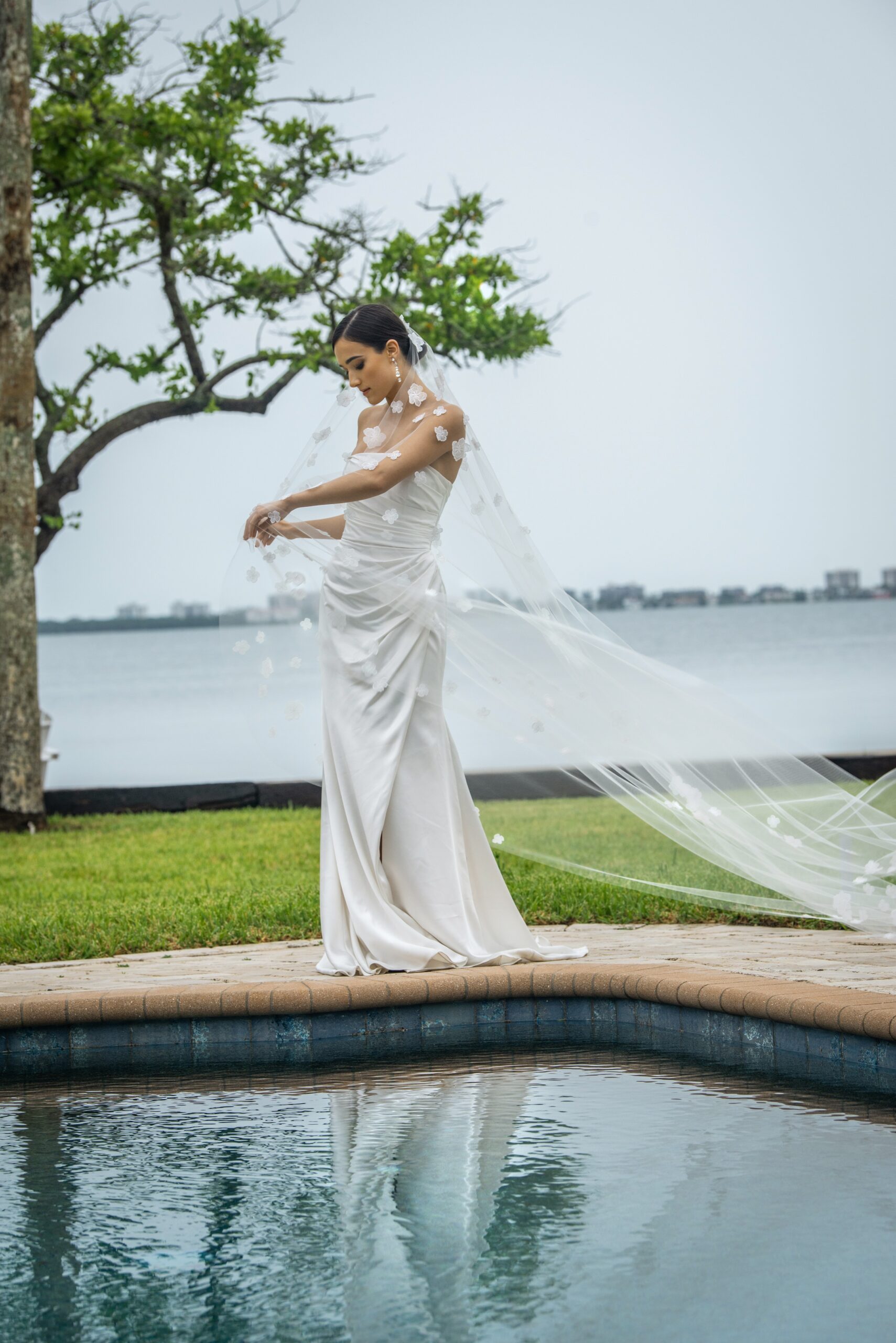 Our Summer Love cathedral features a flowing cascade shape and scattered lace florals